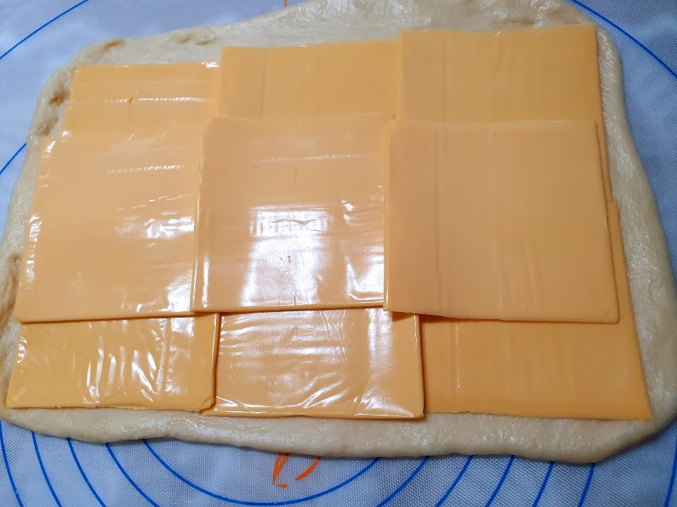 5. 반죽을 밀어서 토핑용 버터 발라주고 돌돌 말아 집어준다.