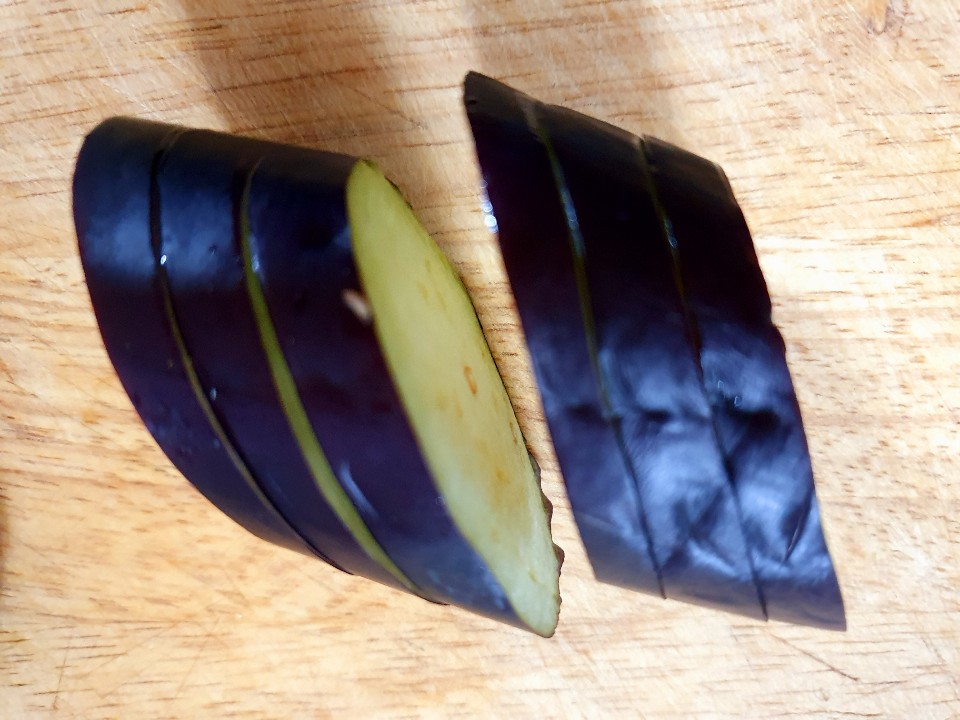 2. 가지 어슷하게 3cm 썰어서 중간에 칼집 2번 내준다 밑에까지 썰어주면 안 되고 2/3 정도 내주세요.
