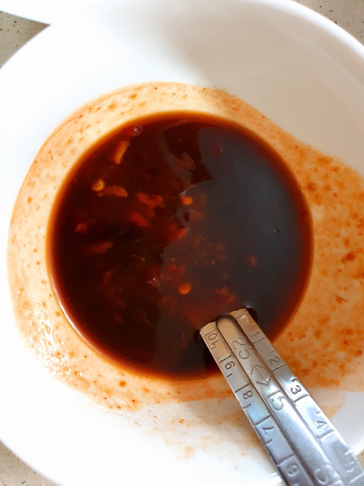 소스 - 굴소스 1T , 두반장 1T , 맛간장 1T(진간장 대체 가능), 물엿 1T, 참기름 1T, 미림 1T -참기름 빼고 섞어둔다.