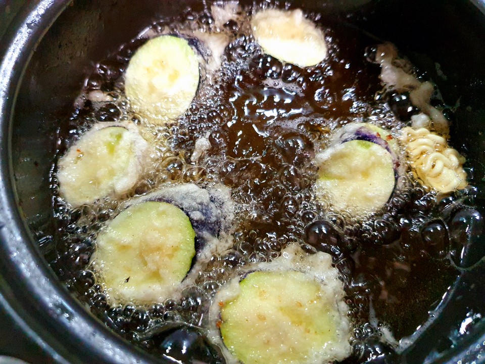 7. 냄비에 기름 올려놓고 튀김온도가 세지 않게 해 주고 반죽 넣어서 올라오면 가지를 반죽에 묻혀 튀겨낸다.