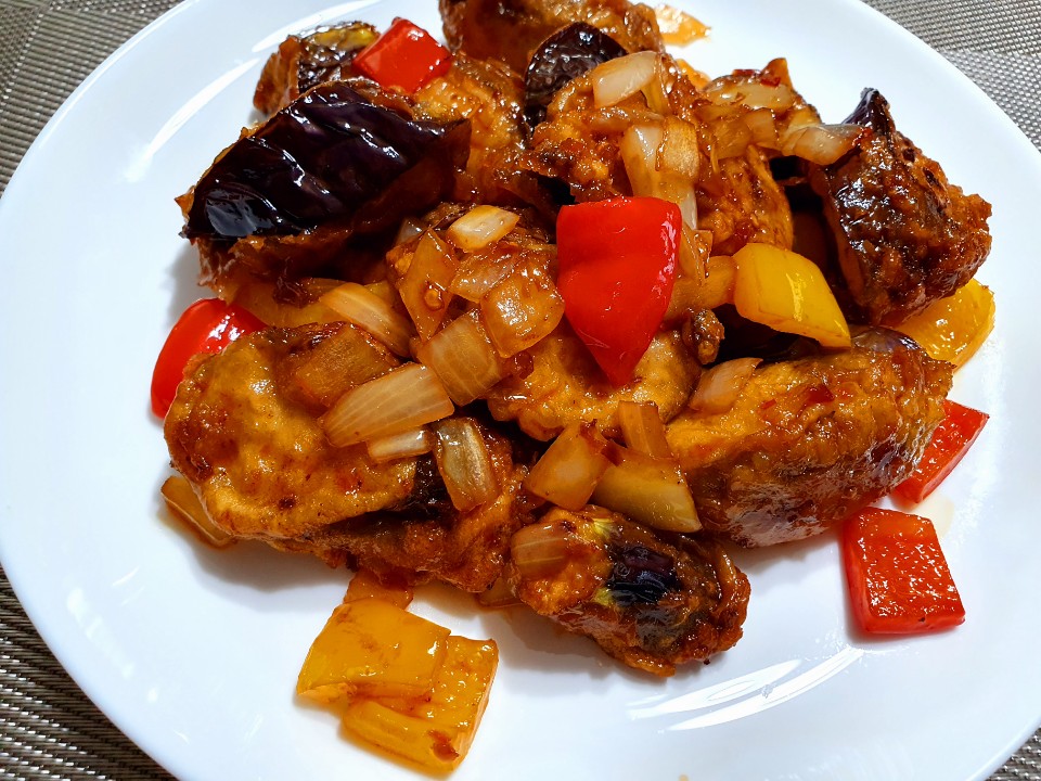 8. 팬에 기름 조금 넣고 양파 넣어 살짝 볶다가 파프리카, 가지 튀김 넣고 소스 넣어 살짝 볶다 참기름 넣어준다.