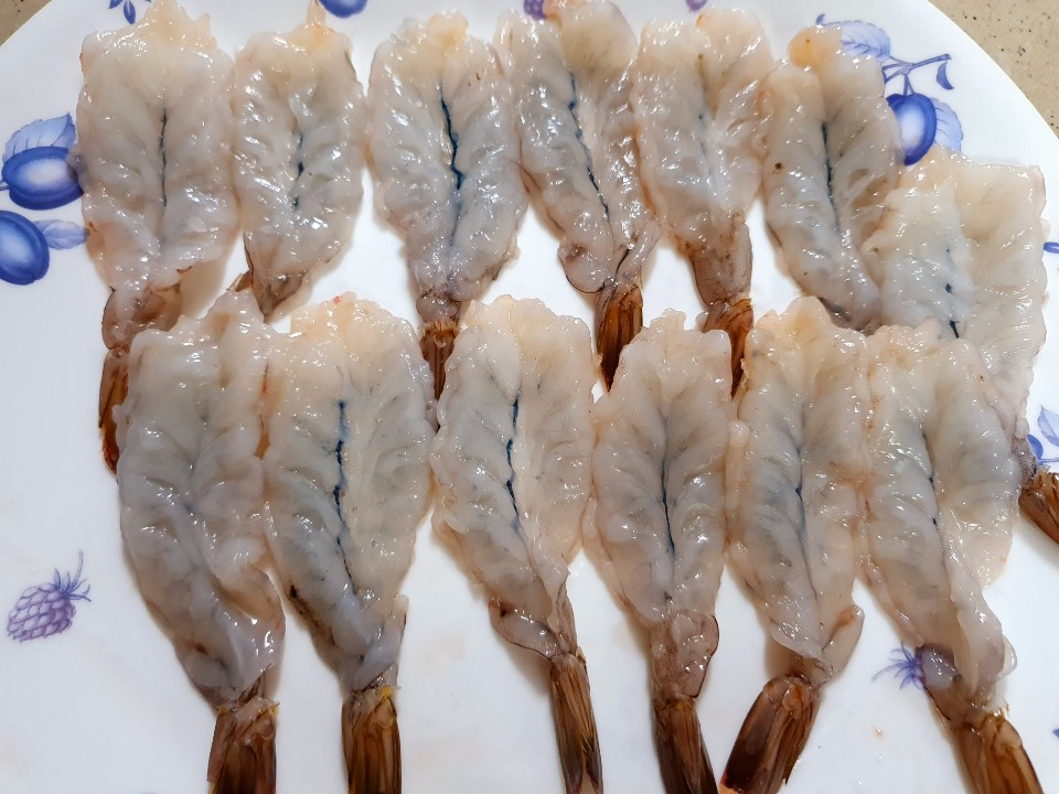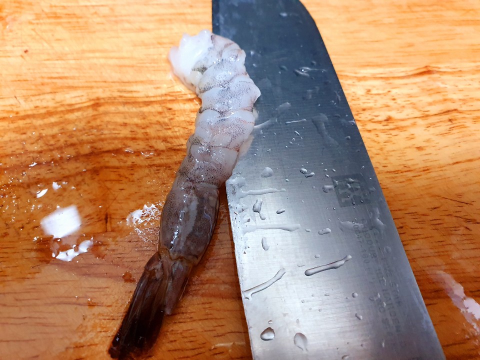 1. 새우는 꼬리 빼고 껍질 까서 씻은 후 등 쪽에 칼을 넣어 포를 떠준후 후추, 생강술을 위에 뿌려준다.