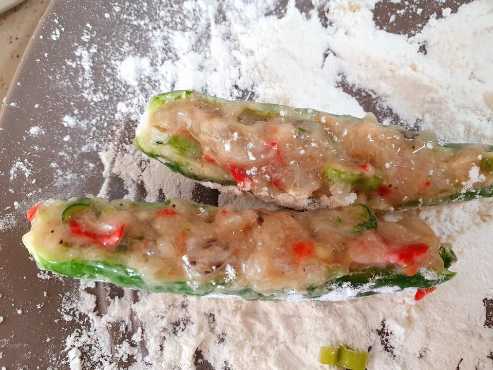 4. 청양고추 윗면만 살짝 포를 떠준후 고추씨를 빼고 밀가루, 양념소를 넣고 밀가루 묻혀준다.
