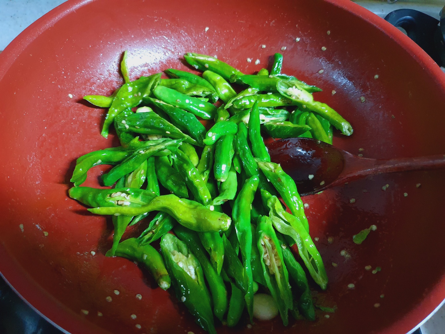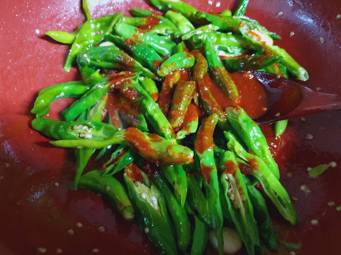 2. 멸치 볶은 팬에 식용유 넣고 꽈리고추 넣어 살짝 볶다가 양념장 2/3 넣고 꽈리고추에 간이 배도록 약간 볶다가