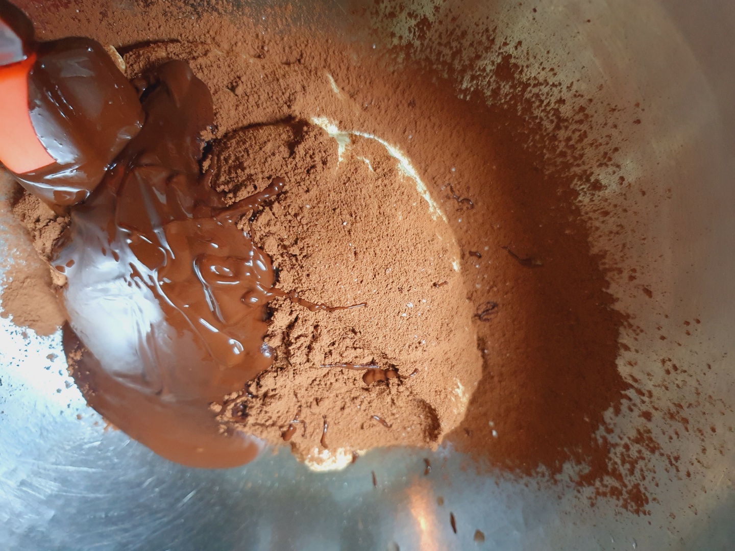 5. 반죽을 반 나누어 준후 한쪽에 코코아 가루랑 초콜릿 녹인 거 넣어준다.