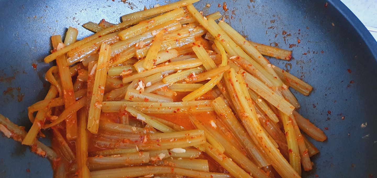 1. 팬에 들기름 마늘 넣고 볶다가 머위대 , 고춧가루 간장 넣고 볶아준다.